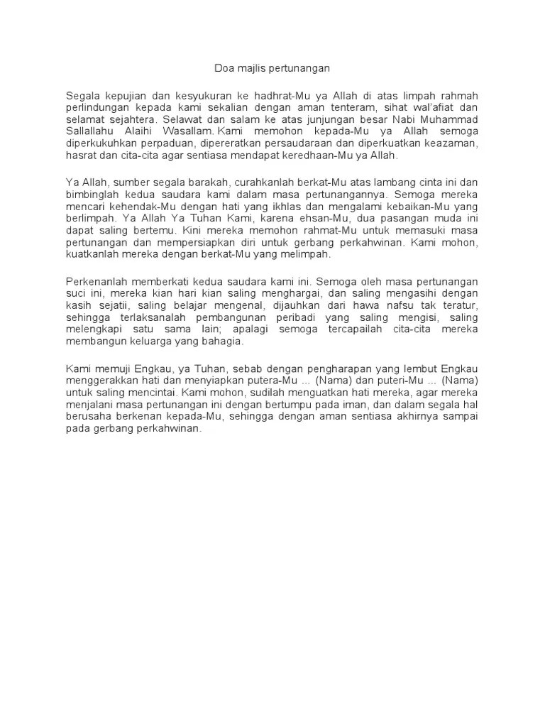 Jadi, untuk meraikan pertunangan ini eloklah kiranya dibacakan doa pertunangan agar ikatan yang dibinakan berakhir hingga ke jinjang pelamin. Kami menyediakan perkhidmatan katering utk majlis pertunangan, pernikahan, perkahwinan, akikah, doa selamat, birthday party & kesyukuran. Majlis pertunangan & doa selamat. اللهم صل على محمد صلاة تنجينا بها من جميع الأهوال والآفات وتقضى لنا بها جميع الحاجات . Majlis pertunangan dan doa selamat. Berikut dikongsikan teks bacaan doa selamat pembukaan majlis perhimpunan dan penutup majlis dalam rumi dan jawi yang boleh anda bacakan . Anda tercari2 dewan untuk buat majlis kecil2 lan??? Untuk saling mencintai dan mengenal hati budi dan perasaan. Pakej pertunangan / doa selamat. Contextual translation of aturcara majlis pertunangan into english. Saya nak ucapkan ribuan terima kasih .